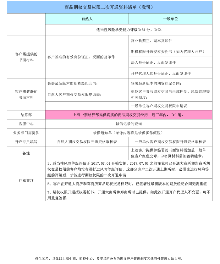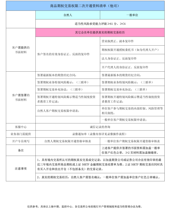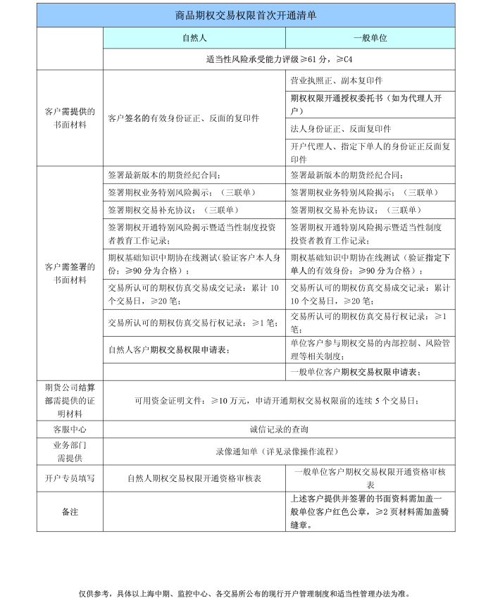 商品期權(quán)交易權(quán)限開(kāi)通清單(首次、二次)
